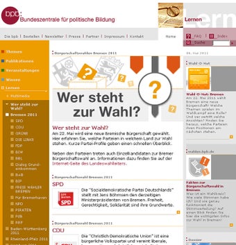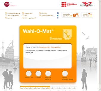 Die Wahlentscheidung fällt vielen Bürgern heutzutage schwer. Die unterschiedlichen Positionen der einzelnen Parteien kennt man meist nur ungenau. Der Wahl-O-Mat für die Bürgerschaftswahl Bremen 2011 bietet Entscheidungshilfe: Über einen Fragebogen nimmt man zu aktuellen Problemen Stellung und findet so heraus, welcher Partei man am nächsten steht.