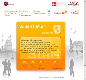 Wahl-O-Mat für die Bürgerschaftswahl Bremen 2011 startet man nach dem Entpacken der ZIP-Datei per Klick auf die Index-Datei im Programmordner. Anschließend nimmt man Stellung zu 38 Fragen rund um Sozialpolitik, Bildung und Integration sowie Umweltschutz oder Kulturförderung. Die gewählten Antworten vergleicht Wahl-O-Mat mit den offiziellen Positionen der Parteien SPD, CDU, Grüne, Die Linke, FDP, BIW, BBL, Dialog Grundeinkommen, B+B, BIP, Freie Wähler Bremen, Für Bremerhaven, NPD, Piraten PdB und RRP. Per Statistik zeigt die Software an, welcher Gruppierung man mit seinen persönlichen Ansichten am nächsten steht.
